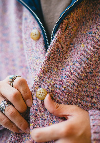 どこか懐かしさを感じる、味わい深い糸のミックス感が魅力のニットカーディガン。