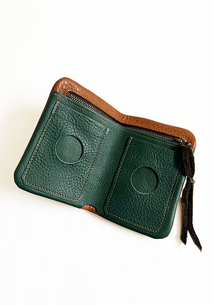 小銭入れが外に付いており、内側の作りは、カードをスライドできる様に革を円形に抜き2つポケットながら、カードの収納・選びやすさを実現しました。