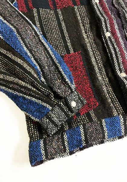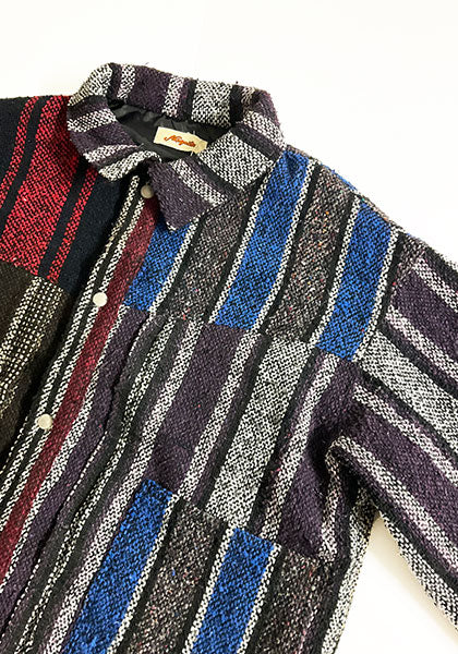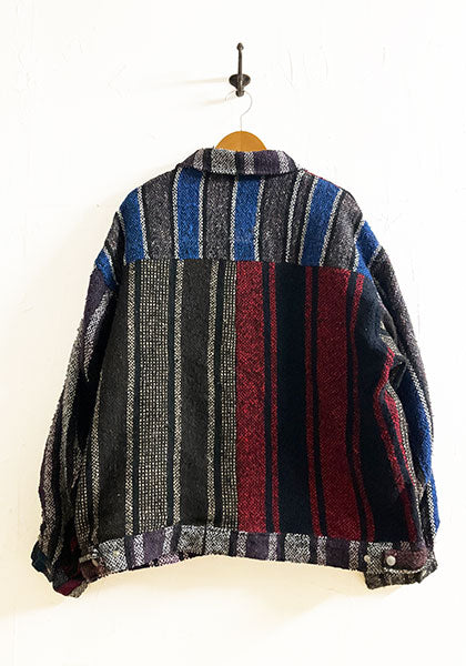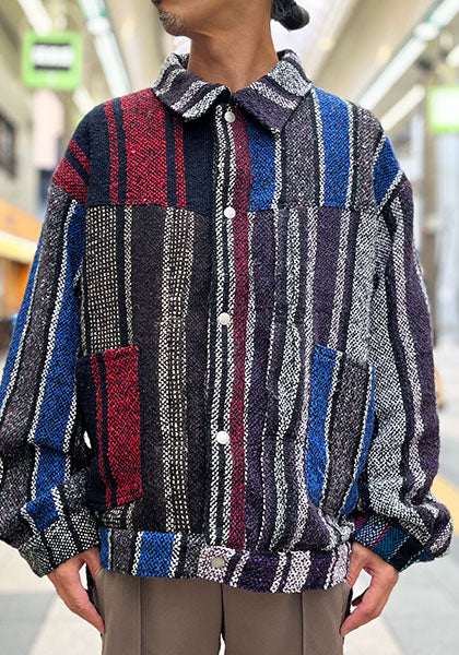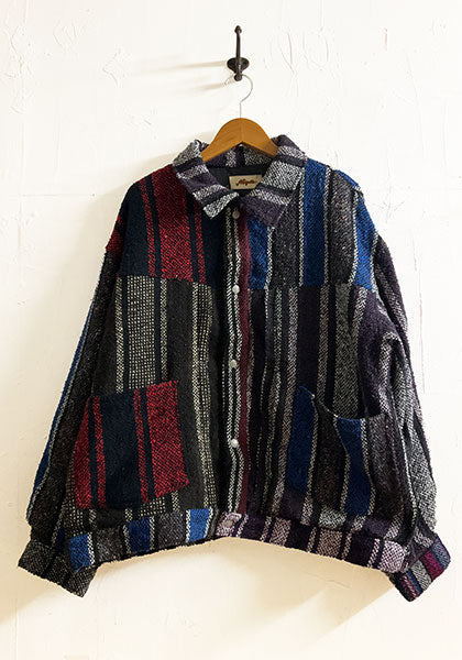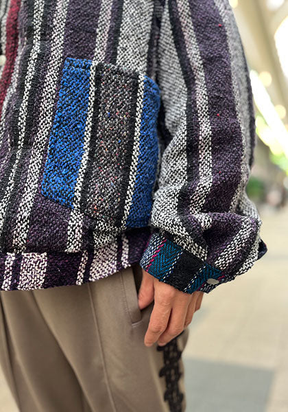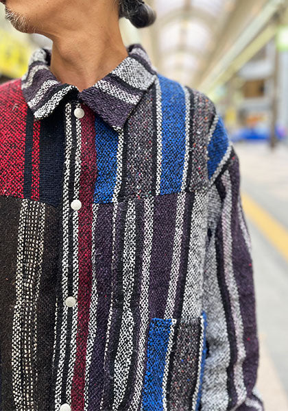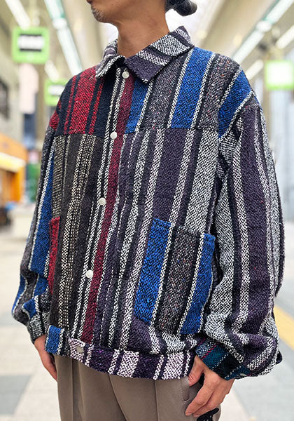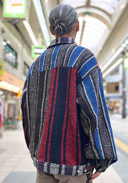 メキシカンパーカーを解体しカラーバランスを整えて再構築したリメイク・ユニセックスジャケット。ややゆったりとしたシルエットで、スウェットやニットの上にも合わせやすく、素材の風合いとストライプカラーがネイティブな雰囲気を演出。他にはない、Nasngwam.らしい遊び心あふれる一着です。