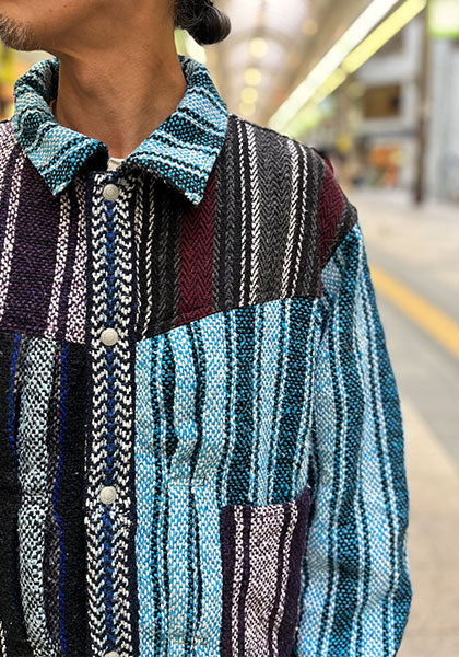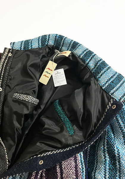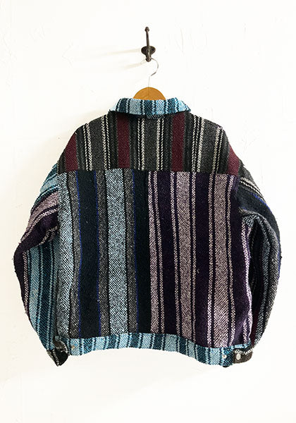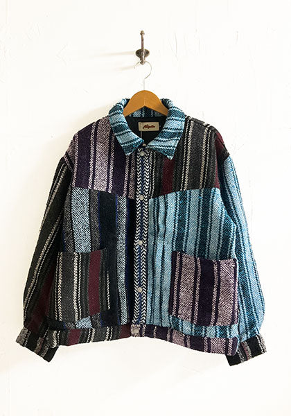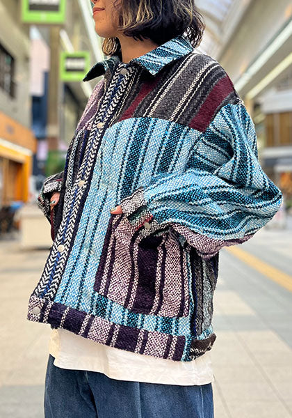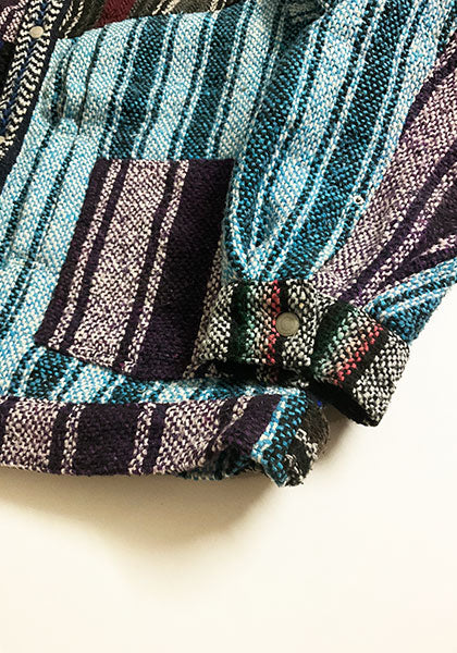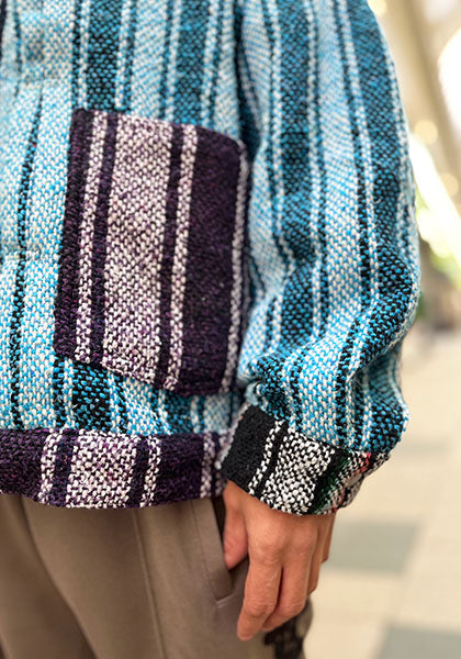 メキシカンパーカーを解体しカラーバランスを整えて再構築したリメイク・ユニセックスジャケット。ややゆったりとしたシルエットで、スウェットやニットの上にも合わせやすく、素材の風合いとストライプカラーがネイティブな雰囲気を演出。他にはない、Nasngwam.らしい遊び心あふれる一着です。