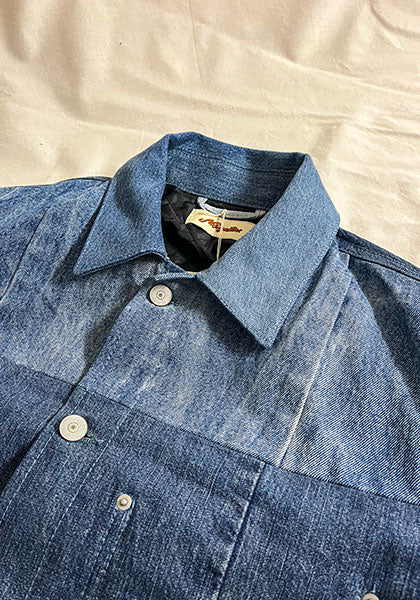 長年穿き込まれたUSEDデニム生地を解体・再構築したリメイクカスタムジャケット。