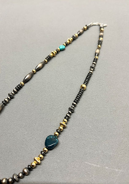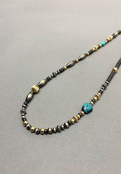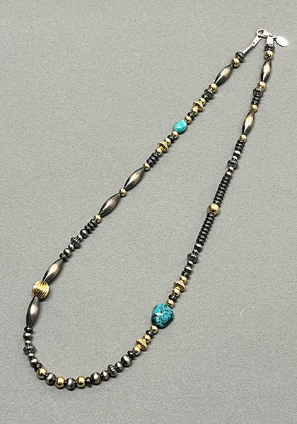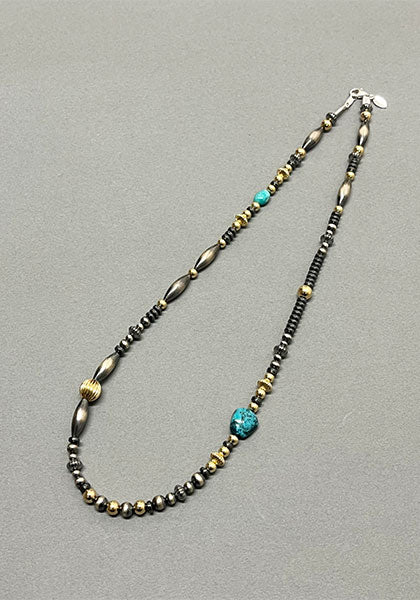 ナバホパール、ナバホメロンビーズ、14金ゴールドフィルドビーズ、ゴールドヘマタイトを組み合わせて仕上げた職人技。