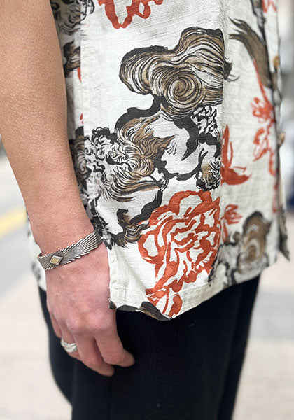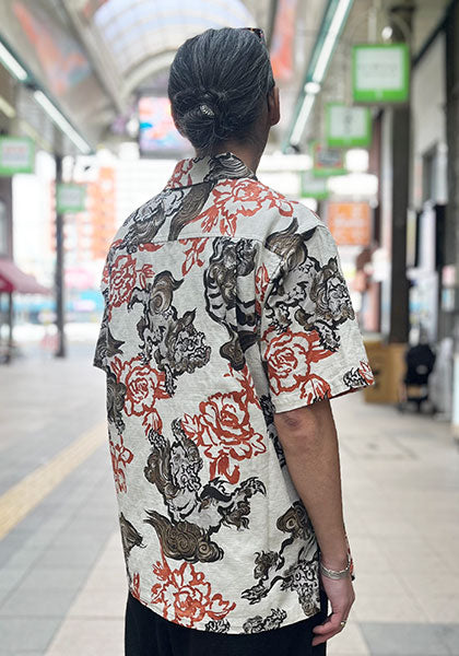ドビー織のコットン⽣地に⽇本伝統の唐獅⼦牡丹の柄をプリントしたアロハシャツ。