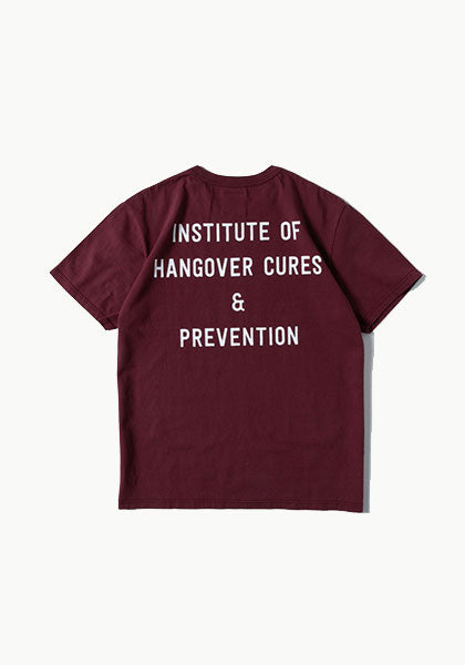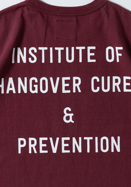 このTシャツは更生施設「INSTITUTE OF HANGOVER CURES & PREVENTION 」公式ユニフォーム。フロントには収容されている学生が毎朝5万回絶叫しながら復唱することでお馴染みのキャッチコピー「NO MORE BEER」をプリント。