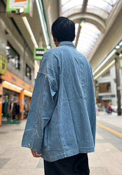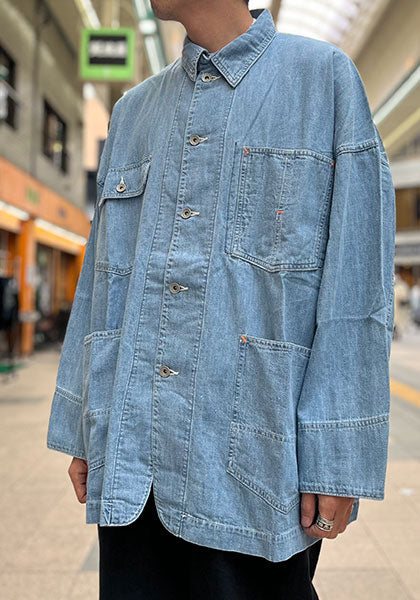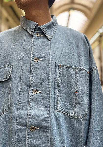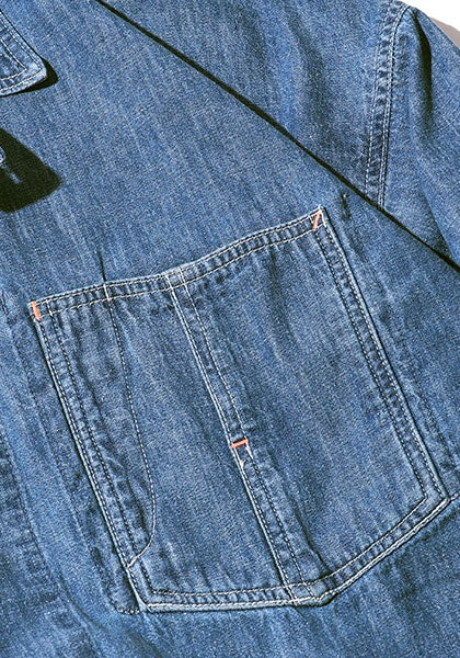 着込んでいくうちに60~70年代のヴィンテージシャツの表情が出るように旧織機で6.5オンスのデニムを編み立てられたカバーオール。