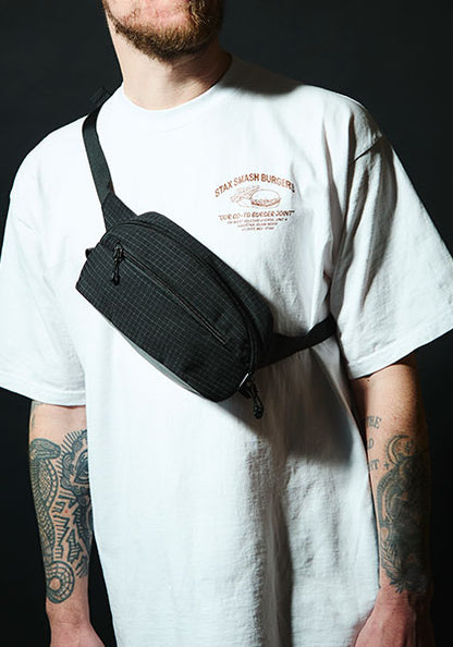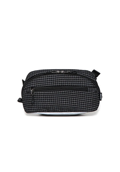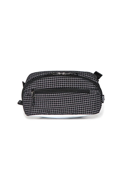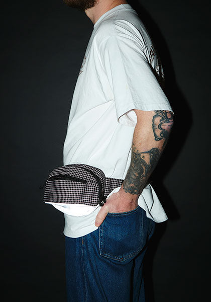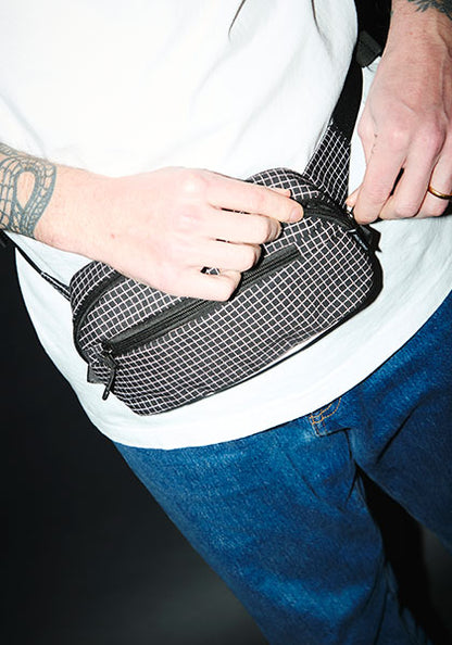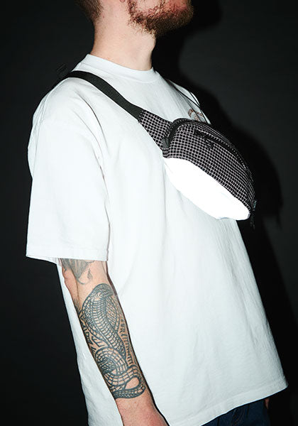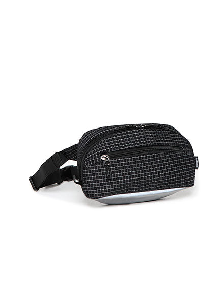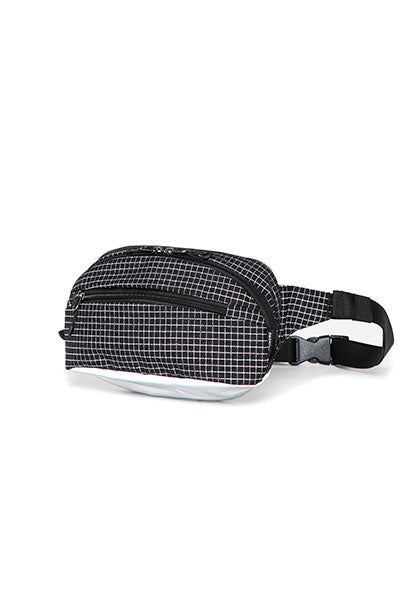 チェック柄の糸にリフレクター素材を織り込んだデザインが特徴のウェストバッグ。