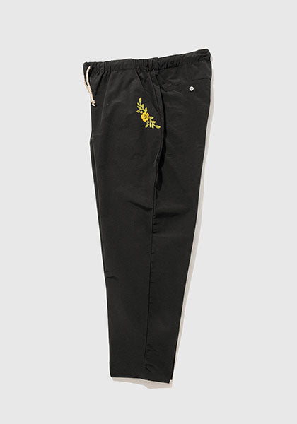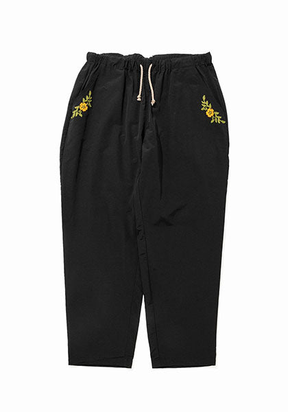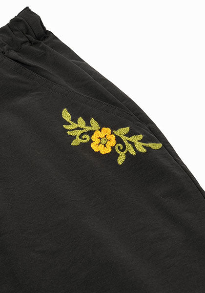 レトロアウトドア感のあるコットンナイロン生地をベースにチェーン刺繍によるハブ ア グレイトフル デイらしいノスタルジックなフラワーデザインがアクセントとなったロングパンツ。