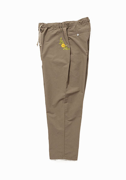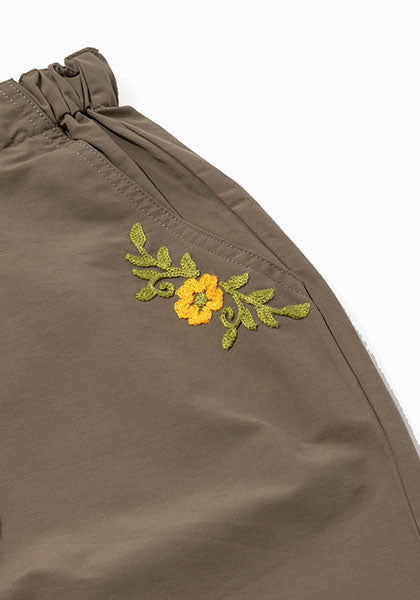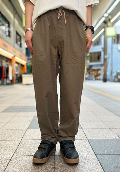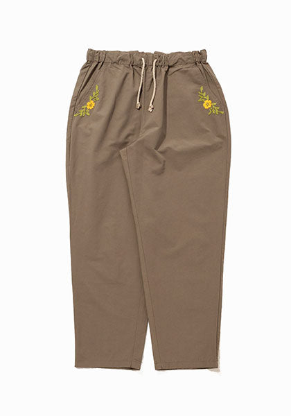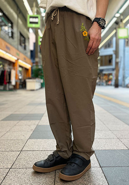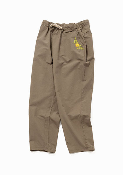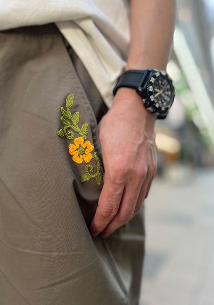 レトロアウトドア感のあるコットンナイロン生地をベースにチェーン刺繍によるハブ ア グレイトフル デイらしいノスタルジックなフラワーデザインがアクセントとなったロングパンツ。