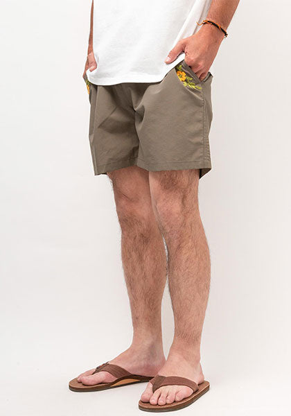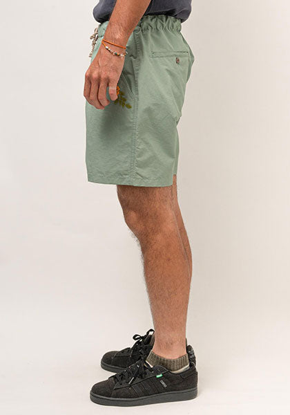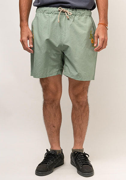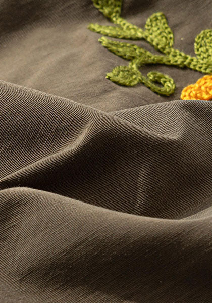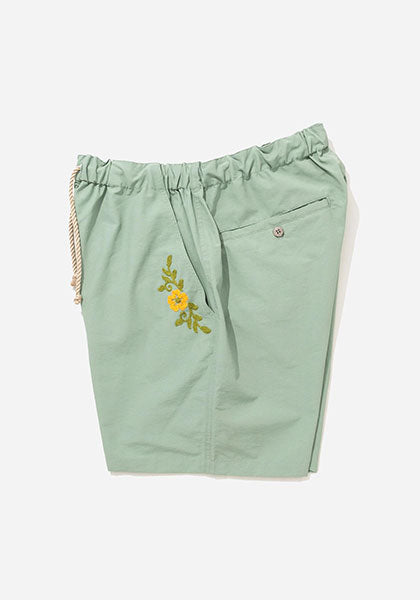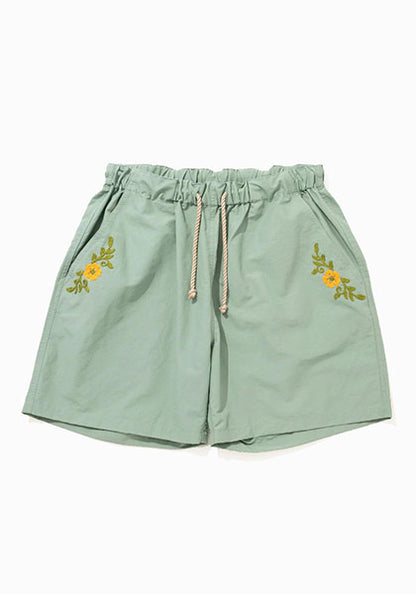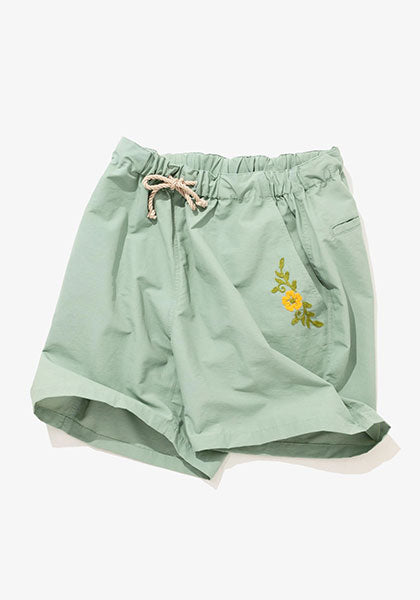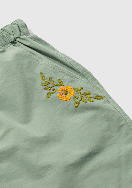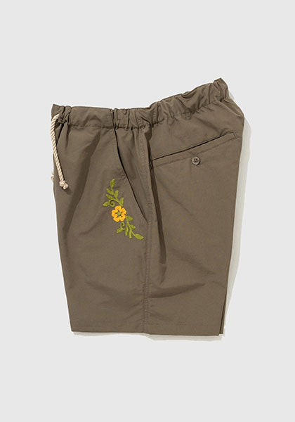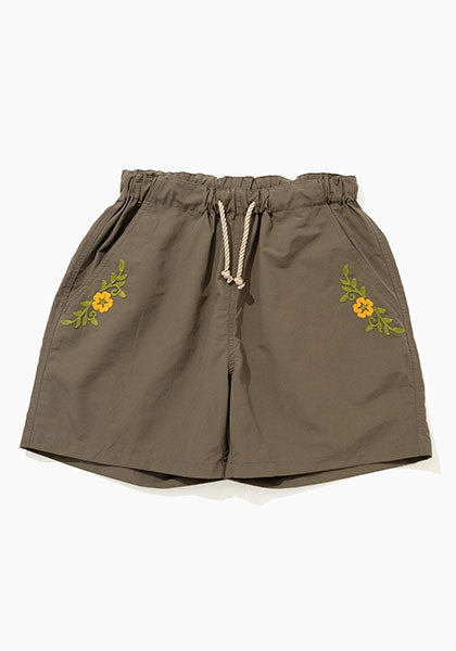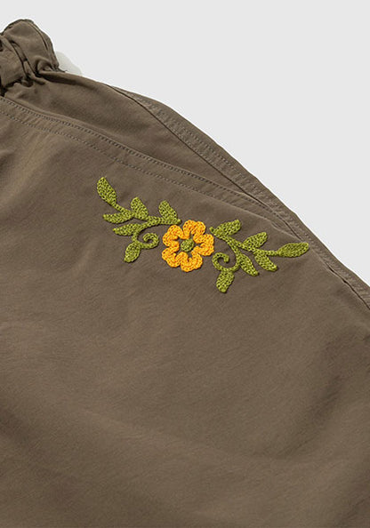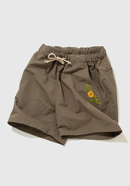 レトロアウトドア感のあるコットンナイロン生地をベースにチェーン刺繍によるハブ ア グレイトフル デイらしいノスタルジックなフラワーデザインがアクセントとなったショートパンツ。