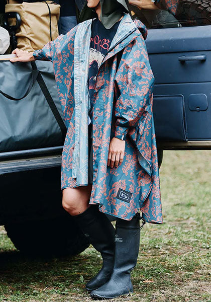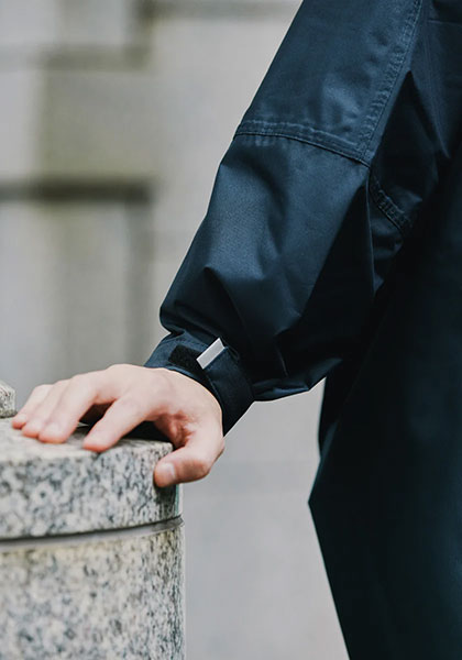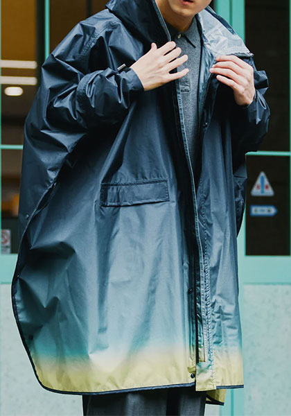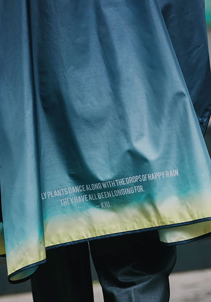 フルジップ仕様で脱ぎ着がスムーズ。ツバ付きのハイネックフードが顔まわりをカバーし、雨の侵入を防ぎます。袖口もボタンで調節できるため、強い雨や風の日でも安心。機能性とデザイン性を兼ね備えたKiUならではのレインポンチョです。