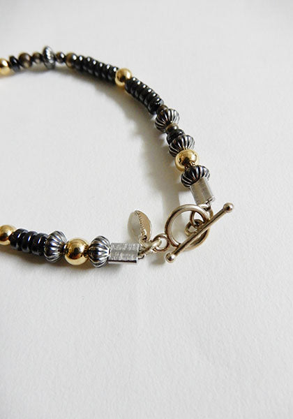 ナバホパール、ナバホメロンビーズ、14金ゴールドフィルドビーズ、ゴールドヘマタイトを組み合わせて仕上げた職人技。