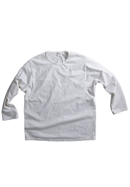 オーバルスリーブの特徴としては、縦楕円状の風変わりの袖に、カットソーの仕様では少し珍しい片方に倒して細幅の2本針ステッチで押さえる仕上げ。